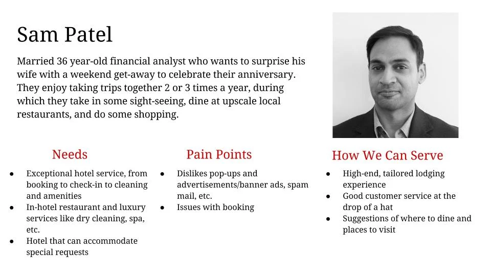 We created a persona based on the information we gained from the survey. Meet Sam Patel, a financial analyst who wants to surprise his wife with a weekend getaway at a 5-star hotel for their upcoming anniversary.